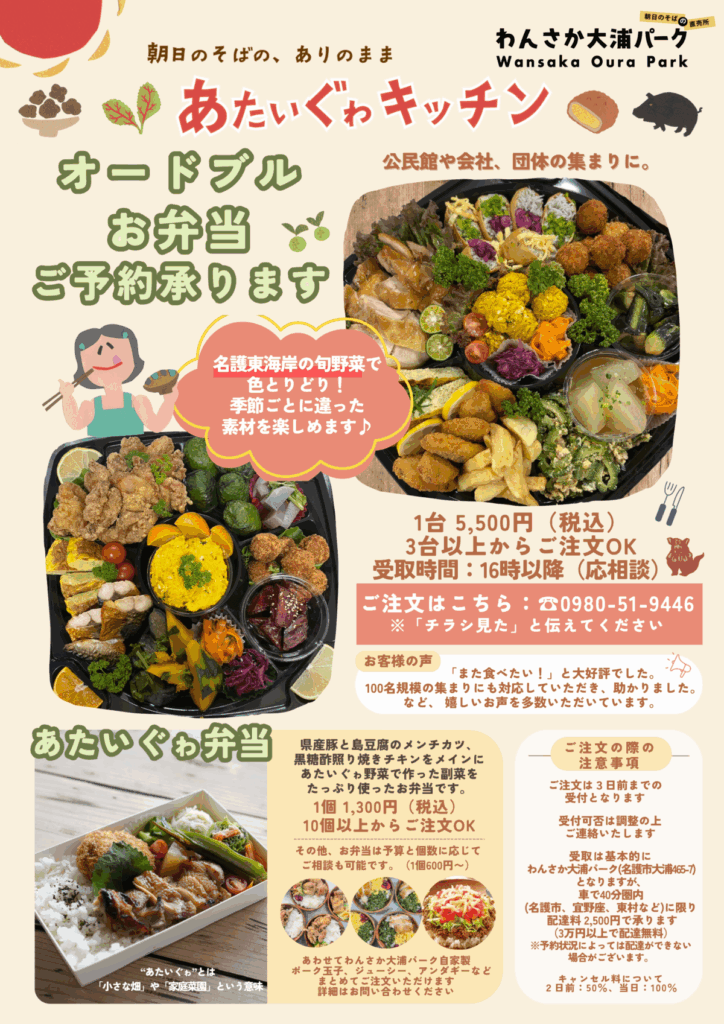 わんさか大浦パーク内レストラン「あたいぐゎキッチン」では、オードブル・お弁当のご予約も承っております。